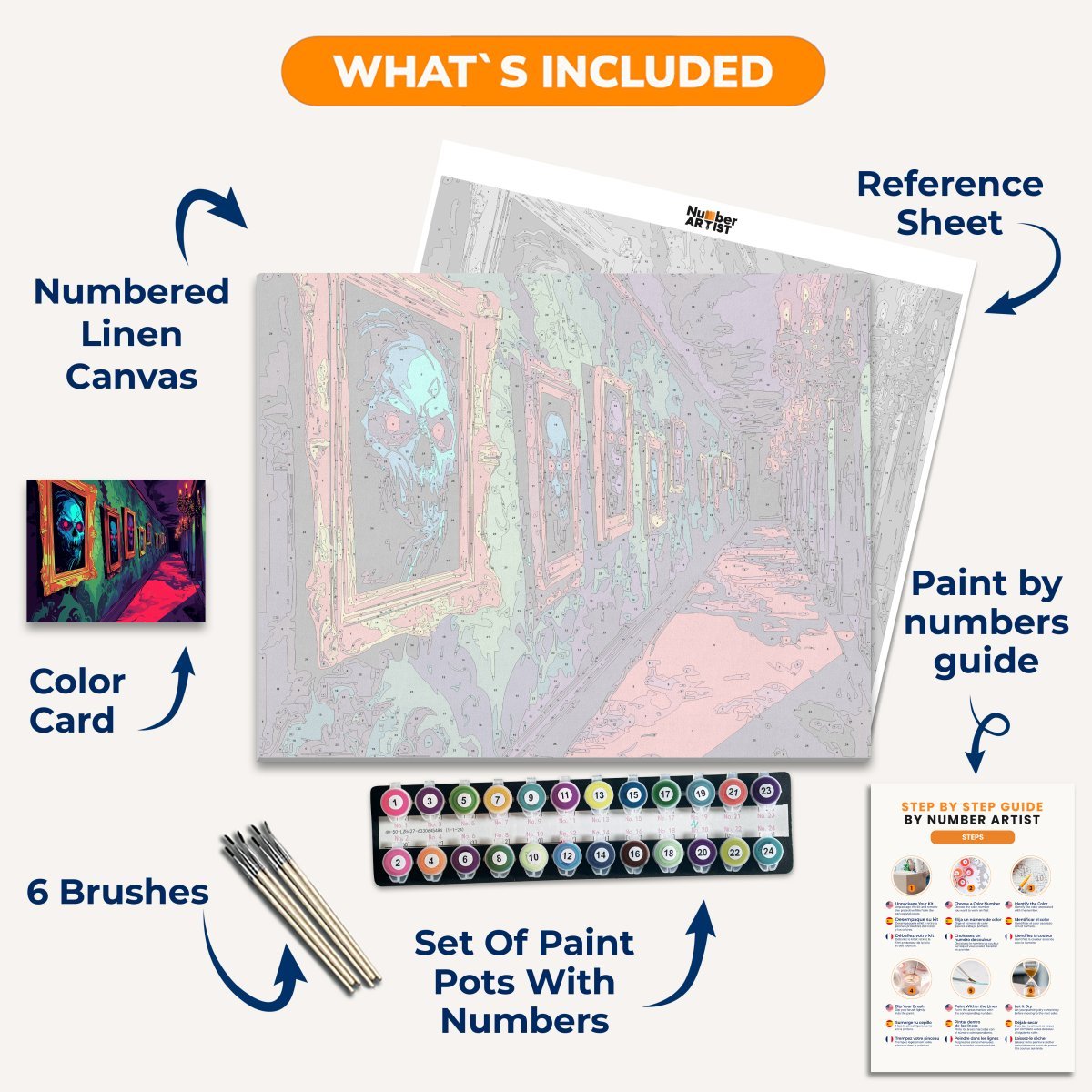 Treten Sie in eine Welt der Kreativität und des Staunens mit dem beobachteten Wesen ein Malen nach Zahlen Kit. Das Bild zeigt einen Flur, der mit mit gerahmten Bildern geschmückten Wänden ausgekleidet ist. Jeder Rahmen enthält ein Porträt eines Schädels, der eine Skelettmaske mit leuchtenden roten Augen trägt. Der Flur erstreckt sich über den Korridor, der schwach beleuchtet zu sein scheint. Der Boden ist gemustert und hindeutet eine historische oder museumähnliche Umgebung. Die Kombination aus komplizierten Details und lebendigen Farben macht dieses Kit zu einer idealen Flucht in Kunst und Ruhe.