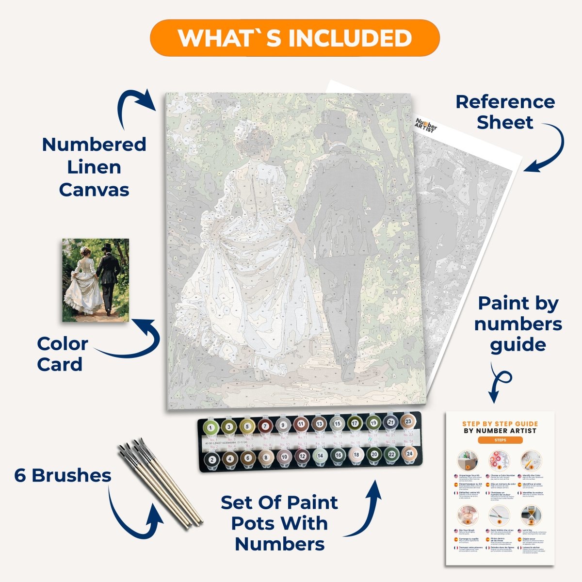 Treten Sie in eine Welt der Kreativität und des Staunens mit der LA -Promenade ein Malen nach Zahlen Kit. Nach dem Bild werden ein Mann und eine Frau in einem Moment romantischer Spaziergang gefangen genommen. Die Frau, die in einem eleganten weißen Kleid geschmückt ist, geht neben dem Mann, der in einem Anzug gekleidet ist. Sie sind auf einem Weg, der durch eine ruhige Landschaft mit üppigen Bäumen unter einem klaren blauen Himmel führt. Die Kombination aus komplizierten Details und lebendigen Farben macht dieses Kit zu einer idealen Flucht in Kunst und Ruhe.