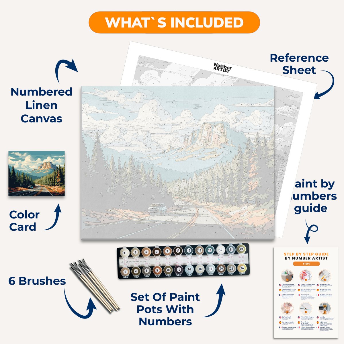 Treten Sie in eine Welt der Kreativität und des Staunens mit dem Sonnenaufgangsweg ein Malen nach Zahlen Kit. Das Bild zeigt eine malerische Berglandschaft im realistischen Stil. Die Szene zu dominieren ist eine herausragende Bergkette unter einem teilweise bewölkten Himmel. Im Vordergrund krümmt sich eine kurvenreiche Straße durch die Landschaft. Ein Vintage -Auto, das an klassische amerikanische Designs erinnert, fährt auf dieser Route. In der Umgebung der Straße sind große immergrüne Bäume, was auf eine ruhige und unberührte Umgebung hindeutet. Auf der rechten Seite des Bildes befindet sich ein majestätischer Berg mit dem Text "Devils Tower" darauf, der seinen Namen anzeigt. Der Gesamteindruck ist von Ruhe und natürlicher Schönheit. Die Kombination aus komplizierten Details und lebendigen Farben macht dieses Kit zu einer idealen Flucht in Kunst und Ruhe.