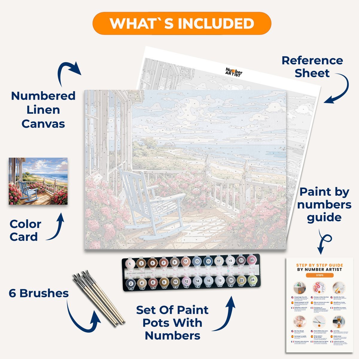 Entra en un mundo de creatividad y asombro con la Paz de la casa de la playa Pintura numérica. La imagen muestra una escena costera serena. Una terraza de madera, adornada con flores y con vistas a una playa de arena, se extiende desde una casa. Una silla blanca invita a uno a sentarse y disfrutar de la vista. El cielo está despejado, y el sol arroja un brillo cálido en los alrededores. La combinación de detalles intrincados y colores vibrantes hace que este kit sea un escape ideal al arte y la tranquilidad.