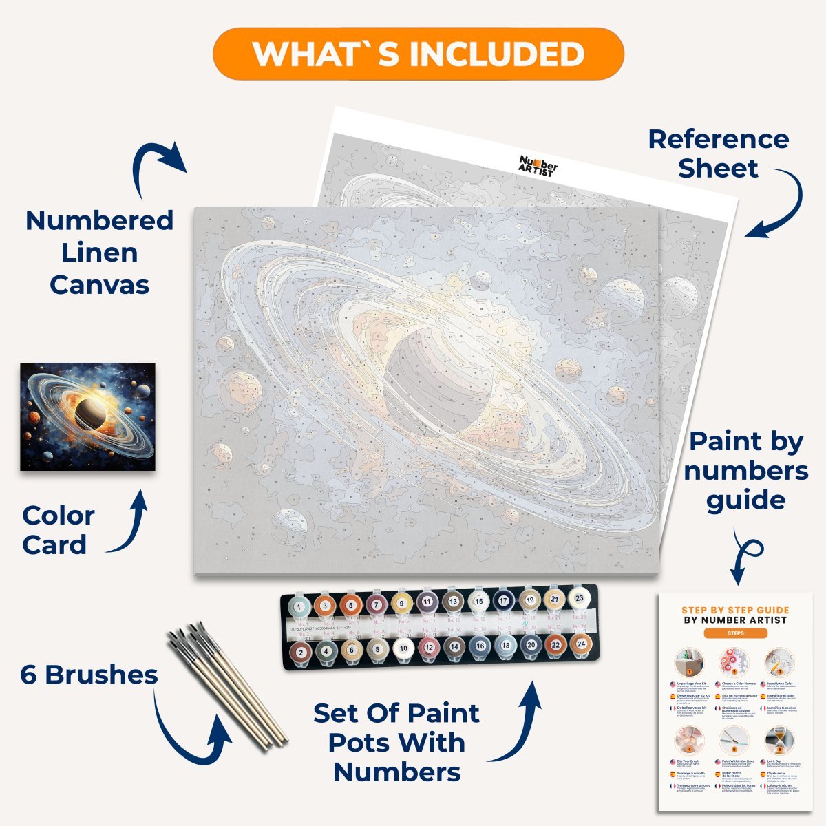 Entra en un mundo de creatividad y asombro con los anillos colosales Pintar por Números Equipo. La imagen presenta una escena vibrante y dinámica centrada alrededor de un planeta negro con múltiples lunas que orbitan a su alrededor, ubicada en el telón de fondo de un cielo azul profundo moteado con numerosas estrellas. El planeta está rodeado por los remolinos de los anillos blancos que sugieren que es un gigante de gas como Júpiter o Saturno. La combinación de detalles intrincados y colores vibrantes hace que este kit sea un escape ideal al arte y la tranquilidad.