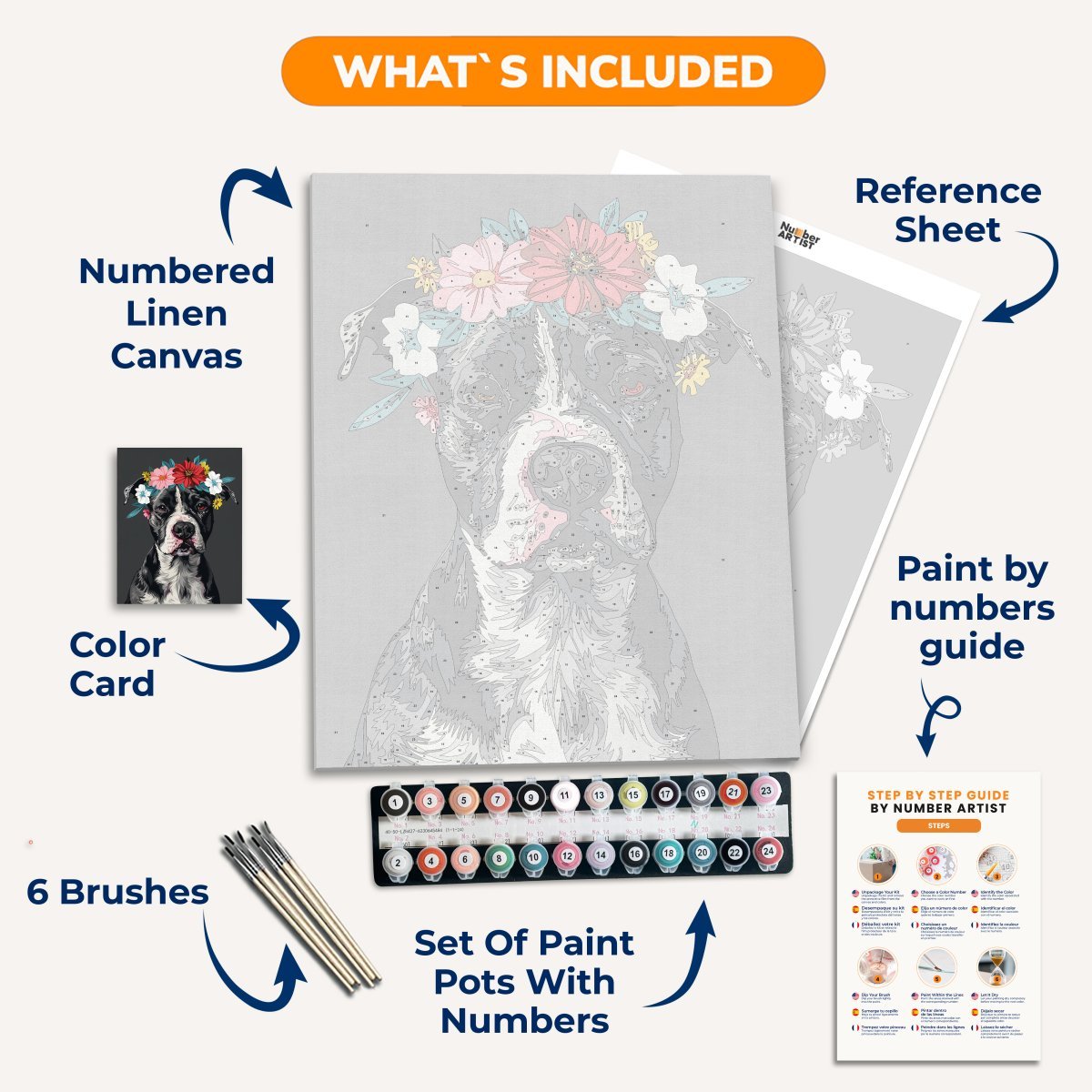 Entra en un mundo de creatividad y asombro con el coronado Pitbull Pintar por Números Equipo. La imagen muestra un sorprendente retrato en blanco y negro de un perro. El perro está adornado con una corona floral en la cabeza, agregando un toque de fantasía a la escena. Sus ojos están acentuados por flores coloridas que las enmarcan, creando un contraste vibrante contra el fondo monocromático. La lengua del perro sobresale juguetonamente, y su boca está ligeramente abierta como si fuera en una expresión de la corteza media. La composición general de la imagen está equilibrada con el perro colocado en el centro, atrayendo la atención del espectador directamente hacia ella. La combinación de detalles intrincados y colores vibrantes hace que este kit sea un escape ideal al arte y la tranquilidad.