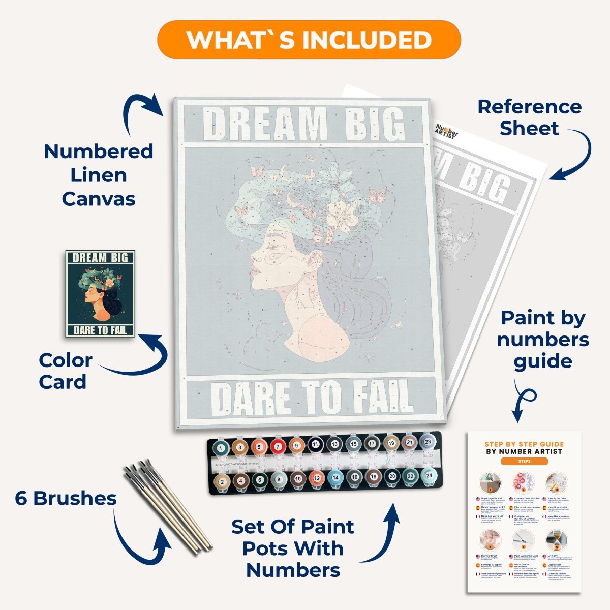 Entrar en un mundo de creatividad y asombro con el sueño grande Pintar por número. Un póster con una ilustración estilizada de la cara de una mujer dentro de un intrincado patrón floral. Sus ojos están cerrados y su expresión sugiere serenidad o confianza. Sobre su cabeza flota un cazador de sueños con varios símbolos y mariposas. El texto en el póster lee "Dream Big" en letras grandes y audaces en la parte superior. Debajo de esto está la frase "Dare to Fail" en letras mayúsculas más pequeñas. La combinación de detalles intrincados y colores vibrantes hace que este kit sea un escape ideal al arte y la tranquilidad.