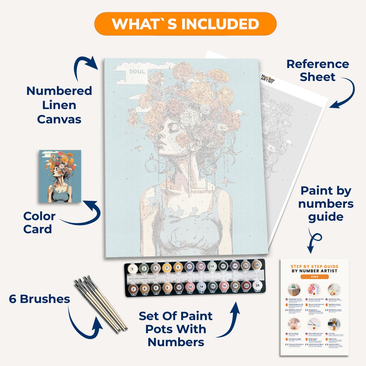 Entra en un mundo de creatividad y asombro con la libertad del alma Pintar por Números En línea. Un póster con una figura femenina central rodeada de una variedad de flores coloridas, sus manos se extienden hacia afuera. Ella tiene una expresión contemplativa y su cabello cae en cascada alrededor de su rostro, mezclando el fondo floral. La configuración parece ser un espacio interior con una paleta de tono genial. La combinación de detalles intrincados y colores vibrantes hace que este kit sea un escape ideal al arte y la tranquilidad.