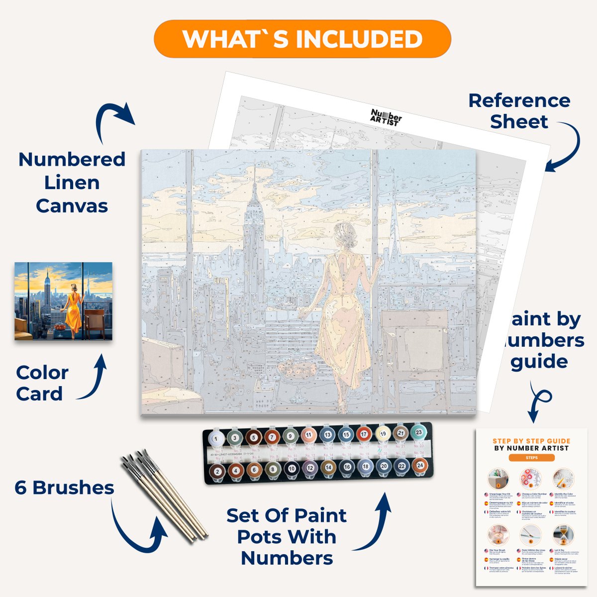 Entra en un mundo de creatividad y asombro con la metrópoli dorada Pintura numérica. La imagen presenta a una mujer alta y elegantemente vestida de pie en un balcón alto con vistas a un paisaje urbano al anochecer. Ella mira en la escena metropolitana debajo de ella, que incluye imponentes rascacielos contra un cielo azul profundo adornado con nubes tenues y una aguja espacial iluminada. El cálido brillo del sol poniente arroja largas sombras en los edificios circundantes. Un autobús urbano es visible en la esquina inferior izquierda. La mujer parece estar sosteniendo una copa de vino, lo que sugiere que podría estar disfrutando de su vista o posiblemente reflexionando sobre sus pensamientos. La combinación de detalles intrincados y colores vibrantes hace que este kit sea un escape ideal al arte y la tranquilidad.