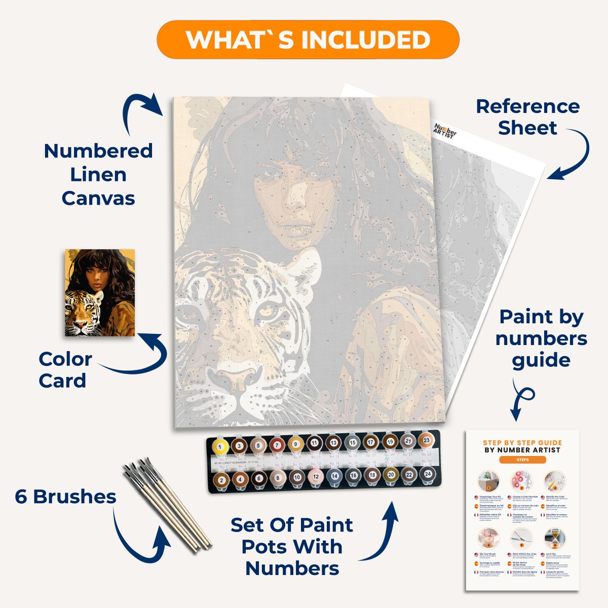 Entra en un mundo de creatividad y asombro con la reina del tigre Pintar por Números Equipo. La imagen presenta a una mujer de pie junto a un tigre adulto. Ella tiene cabello oscuro, usa una prenda de cuello alto con un diseño de estampado de leopardo, y su expresión es intensa. El tigre es grande, con un patrón de piel detallado, y se enfrenta al espectador con la boca cerrada. El fondo es simple, destacando el contraste entre la figura humana y el animal salvaje. La combinación de detalles intrincados y colores vibrantes hace que este kit sea un escape ideal al arte y la tranquilidad.