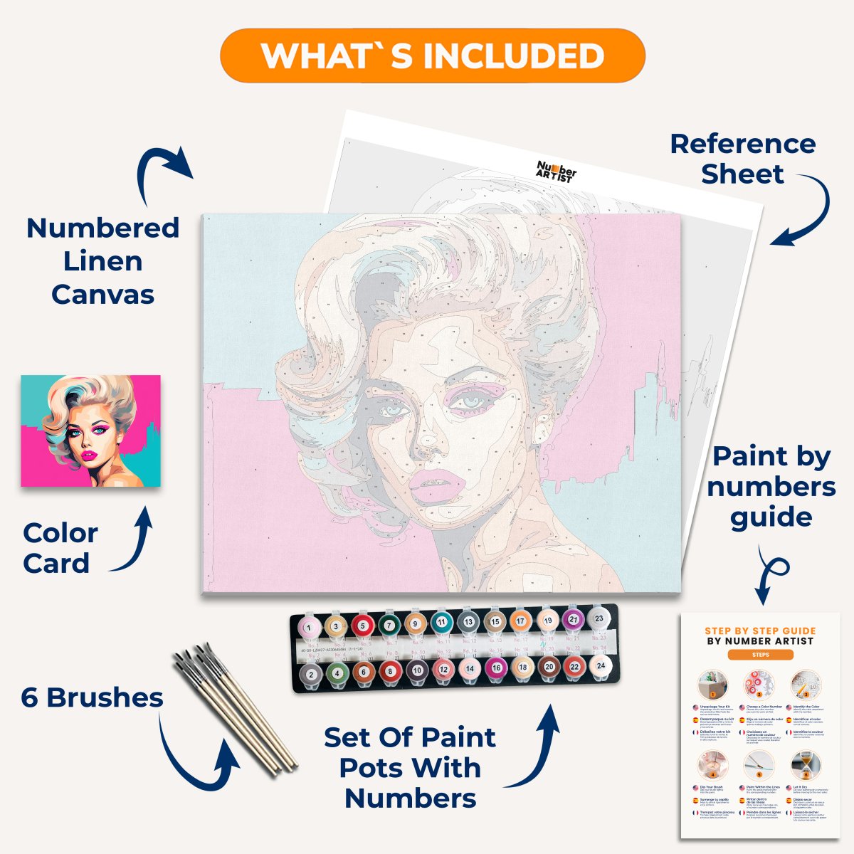 Entra en un mundo de creatividad y asombro con el glamour vintage Pintar por Números Equipo. La imagen muestra un retrato vívido y colorido de una mujer. Ella se caracteriza por el cabello rubio peinado en rizos voluminosos, y sus características se acentúan con sombra de ojos azules y labios rosados. Su atuendo consiste en un vestido rosa vibrante, complementado con tacones rosados. El fondo es una mezcla de diferentes colores, incluidos tonos de azul y rosa, creando un telón de fondo dinámico para el retrato de la mujer. La combinación de detalles intrincados y colores vibrantes hace que este kit sea un escape ideal al arte y la tranquilidad.