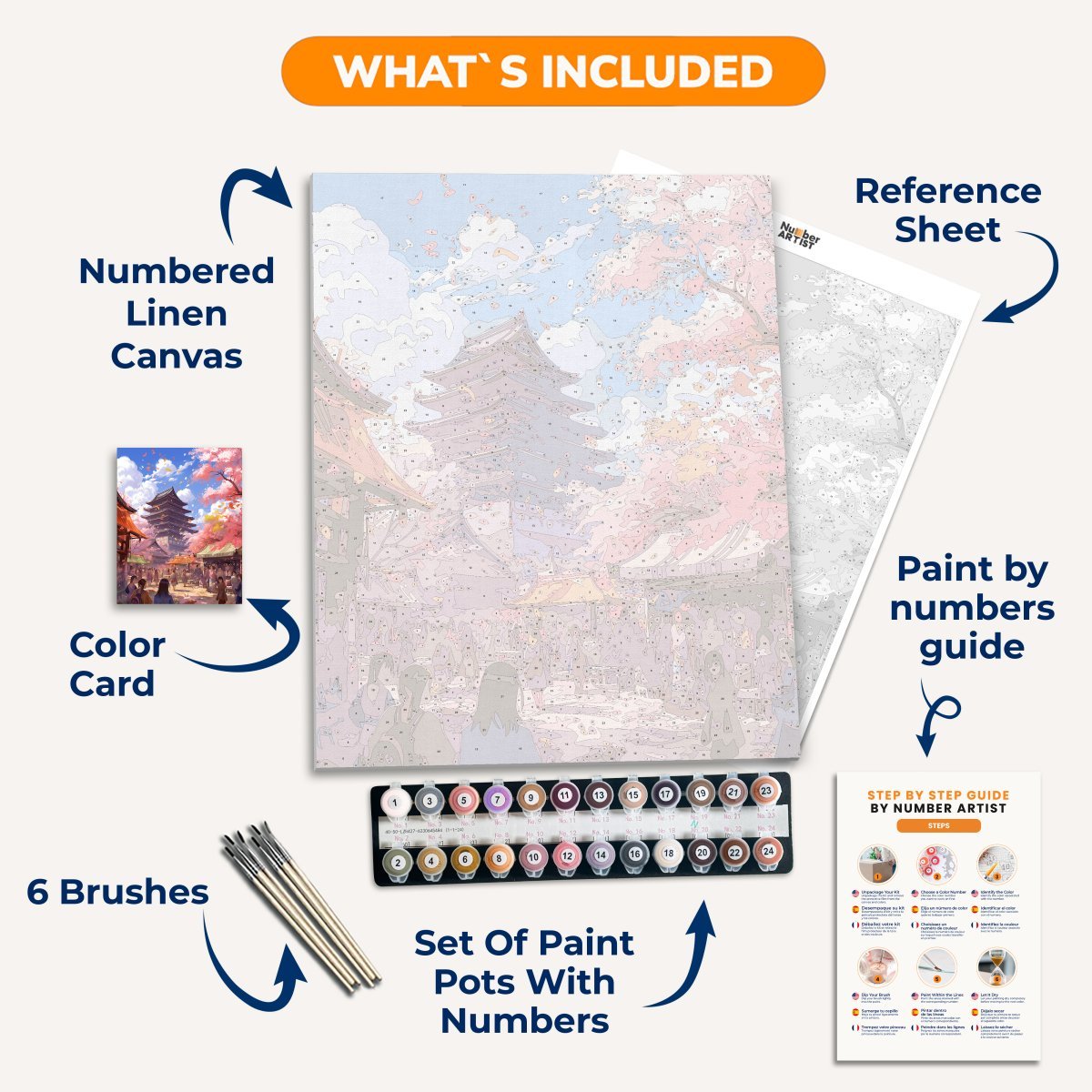 Entra en un mundo de creatividad y asombro con el festival de cerezo Blossom Pintura numérica. Esta imagen muestra una escena animada en lo que parece ser un centro de la ciudad de Asia Oriental durante la primavera. Dominando los antecedentes están los edificios tradicionales de estilo de pagoda japonesa, que sugieren que esta podría ser un área turística o un lugar de importancia histórica. La arquitectura se caracteriza por techos escalonados y intrincados detalles de madera, típicos de las estructuras japonesas.