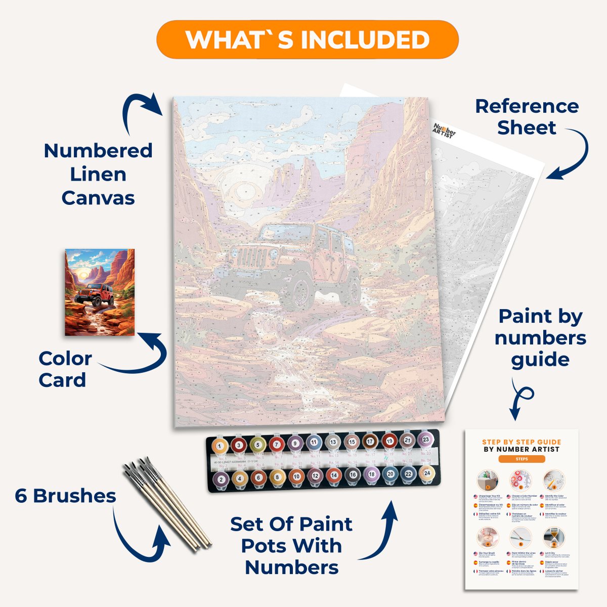Entra en un mundo de creatividad y maravilla con la aventura de Red Rock Pintar por Números Equipo. La imagen presenta un paisaje vibrante dominado por formaciones de rocas rojas y vegetación del desierto. En primer plano, un Jeep Wrangler está atravesando un camino estrecho y resistente tallado en las rocas. El vehículo está en movimiento, dirigiéndose hacia una puesta de sol distante. La escena transmite un espíritu aventurero de exploración y actividades al aire libre. La combinación de detalles intrincados y colores vibrantes hace que este kit sea un escape ideal al arte y la tranquilidad.
