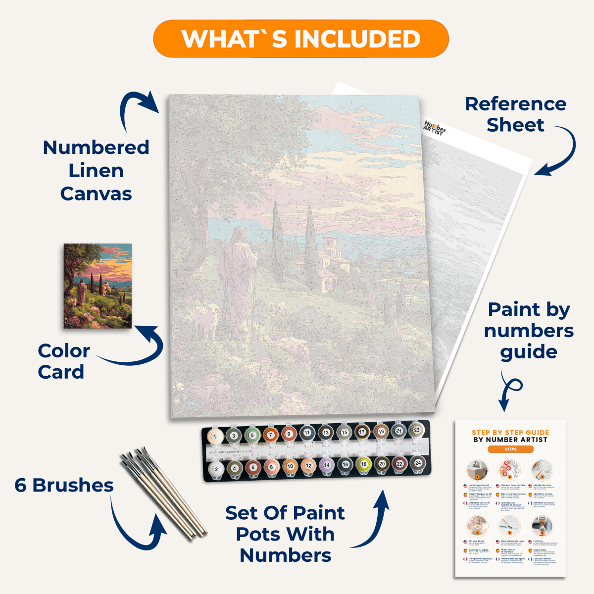 Découvrez la meilleure toile en lin et les pinceaux en bois de qualité supérieure avec chaque kit.