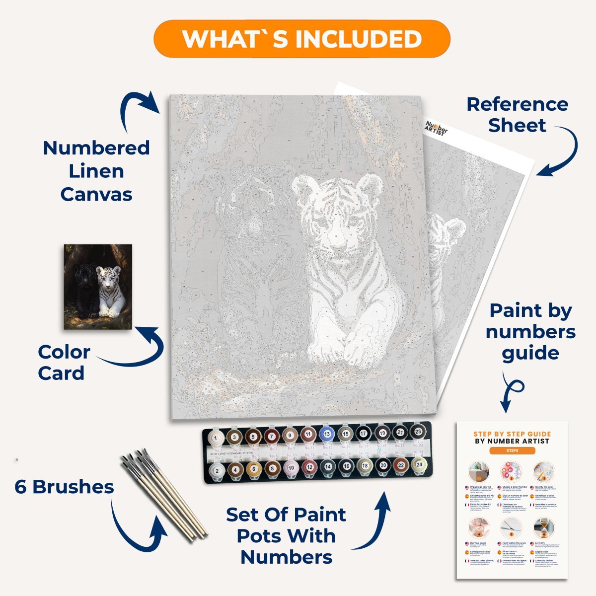 Step into a world of creativity and wonder with the Black & White Paint with Numbers. A striking poster features two cubs, one black and one white, resting within a natural tree cavity. Their relaxed postures suggest a moment of respite amidst their wild habitat. The combination of intricate details and vibrant colors makes this kit an ideal escape into art and tranquility.