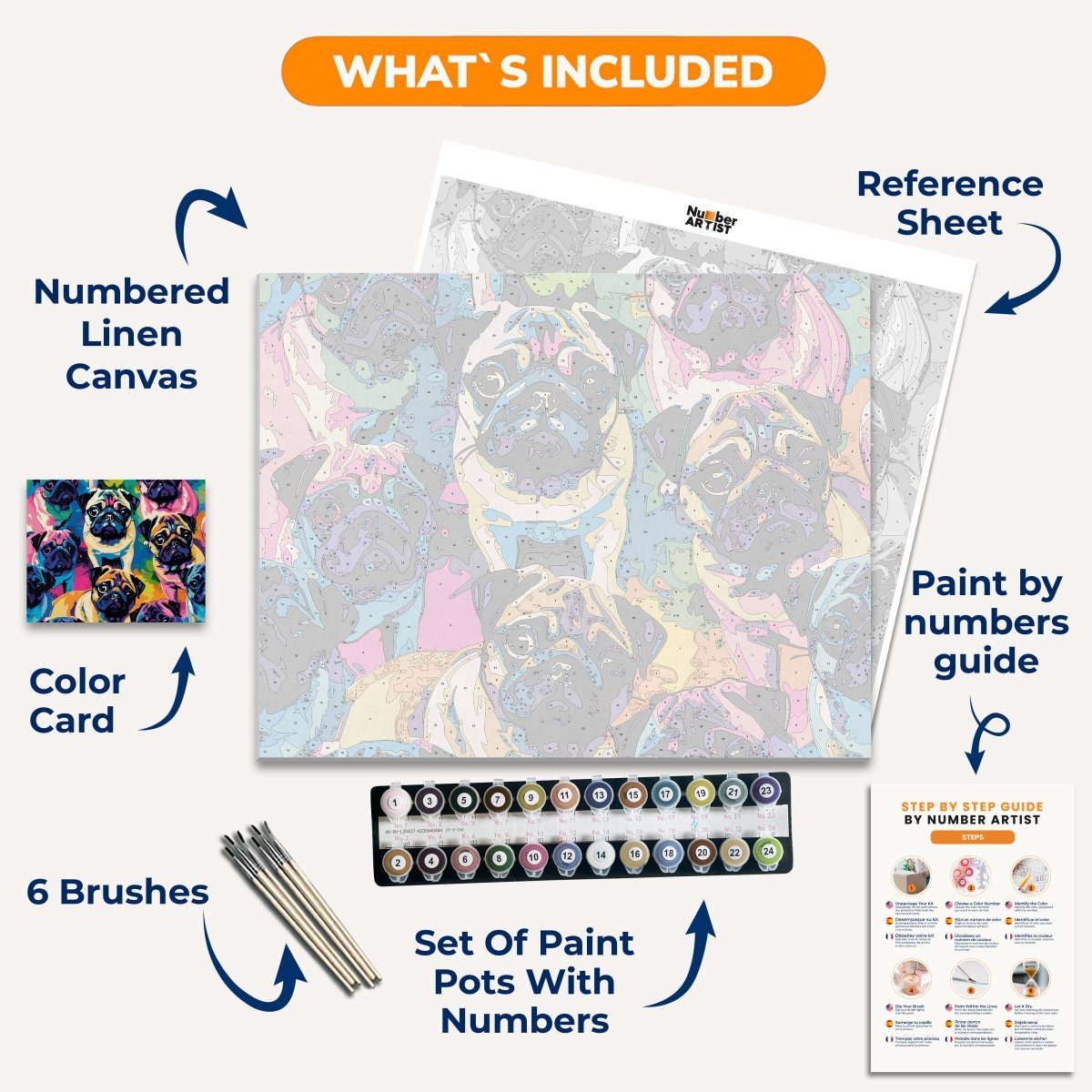 Step into a world of creativity and wonder with the Pug Family Paint By Numbers Kit. A vibrant and colorful poster featuring a pattern of pug dogs against a multicolored background. The dogs appear in various sizes and positions, creating a playful and dynamic visual effect. The combination of intricate details and vibrant colors makes this kit an ideal escape into art and tranquility.